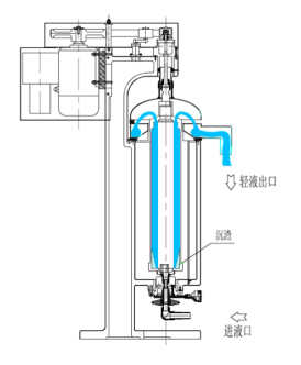 主軸帶動轉(zhuǎn)鼓繞自身軸線高速旋轉(zhuǎn),在轉(zhuǎn)鼓內(nèi)形成強(qiáng)大的離心力場。物料由底部進(jìn)料口進(jìn)入轉(zhuǎn)鼓內(nèi),在離心力作用下,迫使物料沿轉(zhuǎn)鼓內(nèi)壁向上流動。質(zhì)量輕的液體經(jīng)轉(zhuǎn)鼓上部排液口排出,通過集液盤回收;質(zhì)量重的固體沉積在轉(zhuǎn)鼓內(nèi)壁上,形成沉渣層,停機(jī)后人工清除。